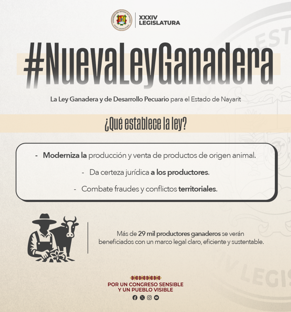 Local ¡Histórico para la ganadería en Nayarit! julio 14, 2025 Admin ¡Histórico para la ganadería en Nayarit!La nueva Ley Ganadera y de Desarrollo Pecuario impulsa la organización, frena los fraudes y da certeza a miles de productores.