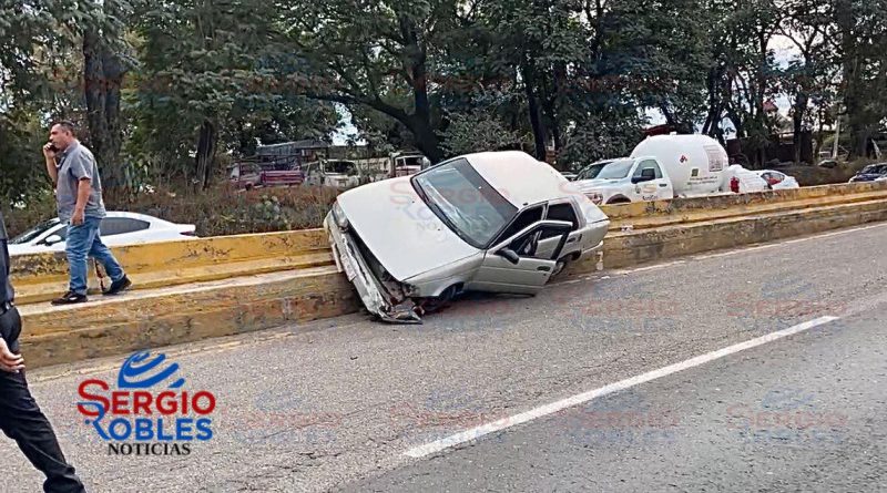 ACCIDENTE EN EL LIBRAMIENTO DE TEPIC TERMINA CON AUTO SOBRE EL MURO.